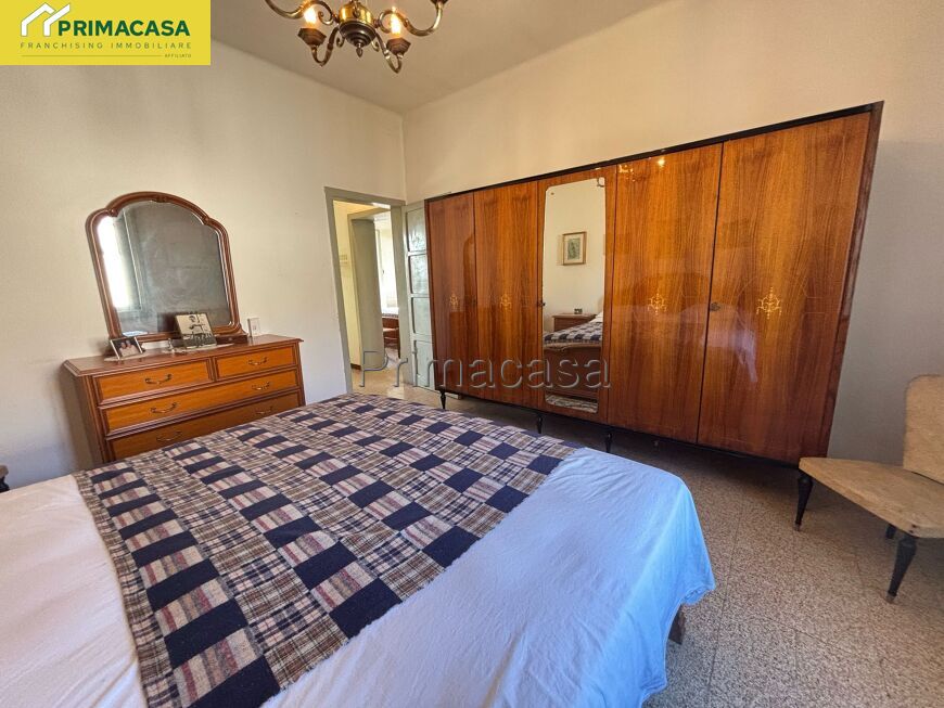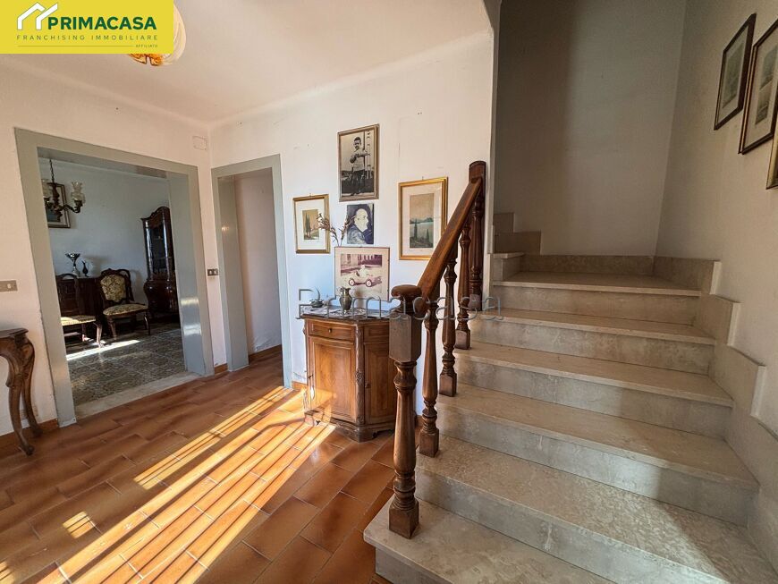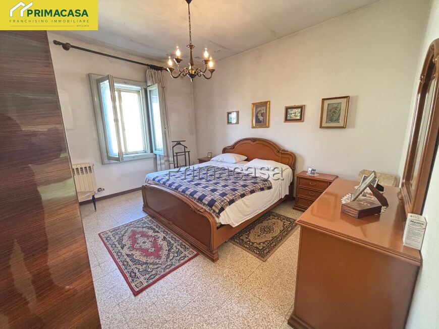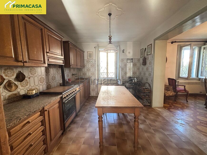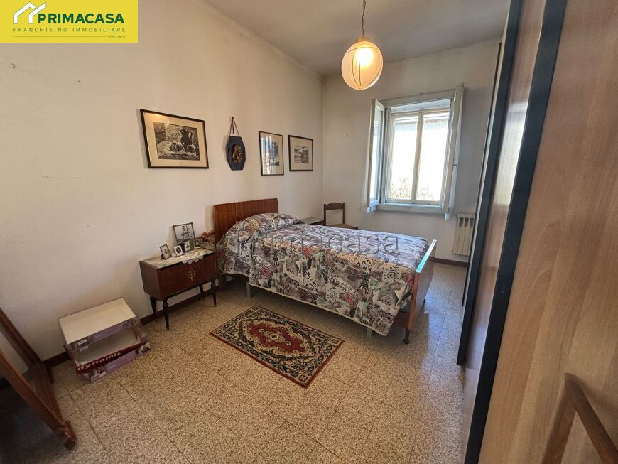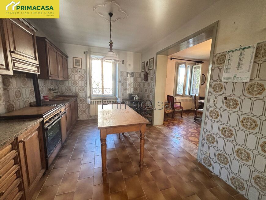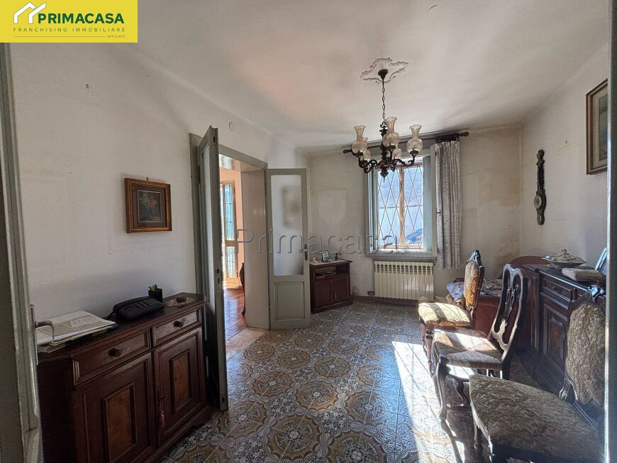 Abitazione d'angolo di ampia metratura, disposta su due piani, con corte esclusiva, deposito e garage con tettoia e sovrastante ripostiglio in corpo separato. Posizione tranquilla comoda al centro.